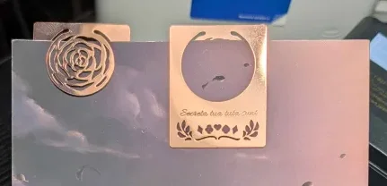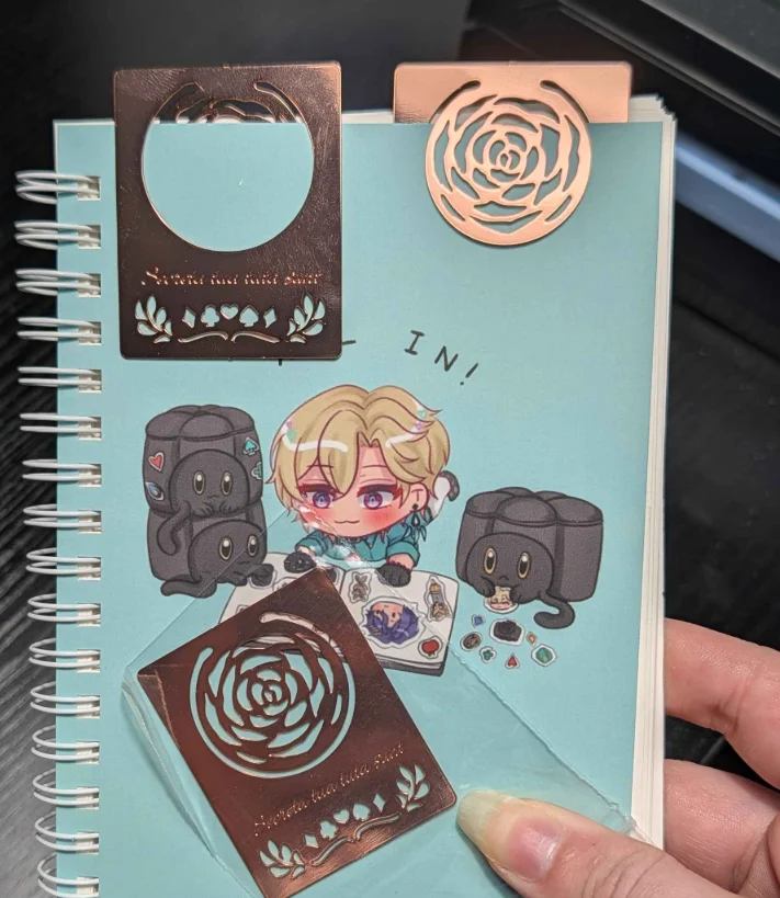Material: I got the rose gold color and it's LOVELY Pattern: They rounded my corners a bit, within a reasonable amount, and there's no sharp edges or snagging to be worried about. Slides onto a page with no issue. Customized Services: Very helpful staff and happy to help, made my product come to life better than I could imagine. When requested the seller was able to do both laser engraving AND cut outs. The products have a nice thickness, feel good in the hand. I'm very pleased and I know the reciepients are going to love them. Mine were 50*40*0.5mm if anyone is curious or needs that info.